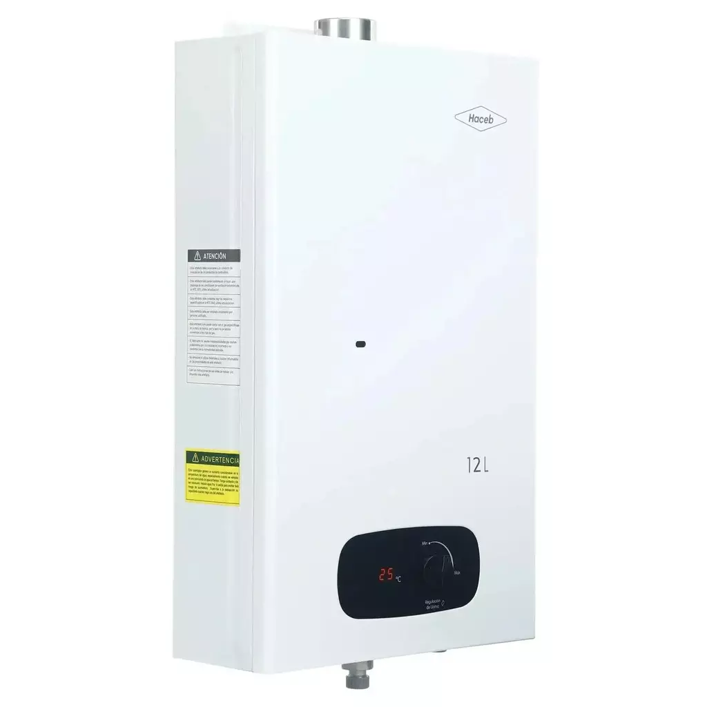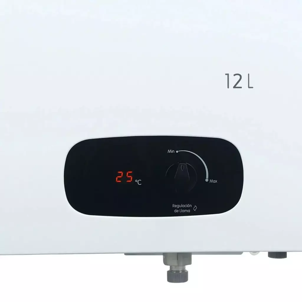 Calentador de agua, paso a gas natural, capacidad de 12 Lts por minuto, tiro forzado, temperatura regulable y Display indicador para visualizar la temperatura de salida del agua e información de funcionamiento. Operación automática, perillas de fácil manejo para controlar la temperatura del agua y el ahorro del gas, además cuenta con visor de llama para observar el funcionamiento del quemador. Vive tranquilo, nosotros te protegemos con nuestro sistema de seguridad, controla el tiempo de tus baños, temporizador que apaga el calentador luego de 20 minutos de uso continuo. Incluye ducto de evacuación y requiere toma eléctrica con polo a tierra, el ducto puede ir directo al exterior.