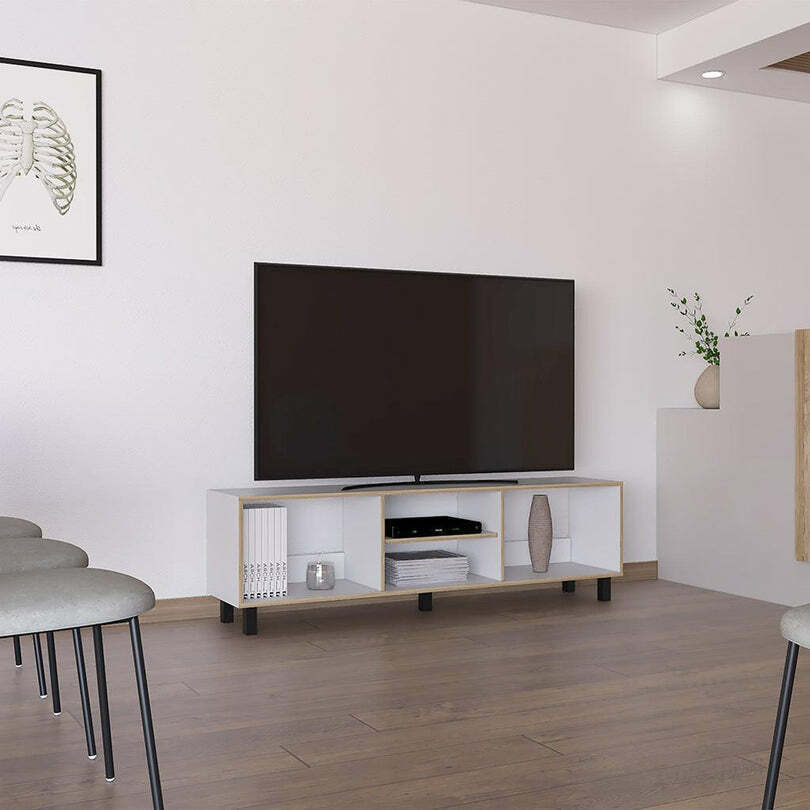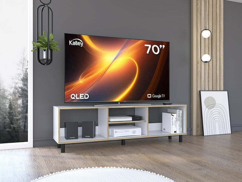 Mesa para TV de 70". cuenta con un entrepaño y cuatro compartimentos para almacenar objetos.