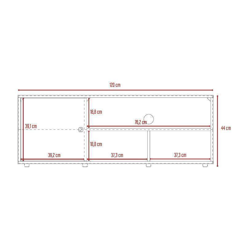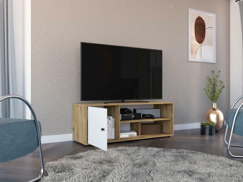 Mesa para TV, para TV de hasta 55", con variedad de entrepaños, 1 puertas batientes y patas metálicas.