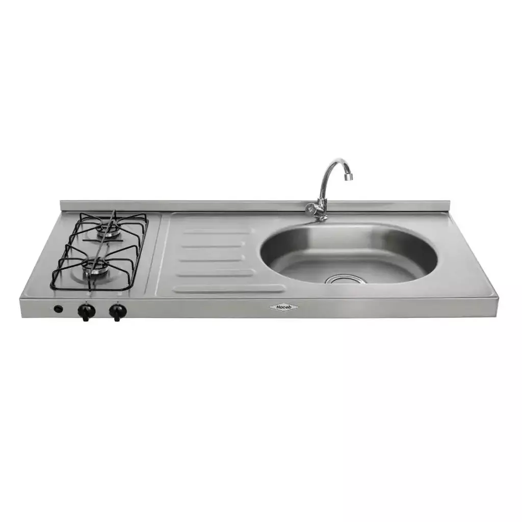 Mesón en acero inoxidable de 1.20 metros de ancho, con ubicación derecha del pozuelo. 2 fogones a gas con parrillas con puntos de apoyo óptimos por recipiente para más seguridad. La ubicación de sus perillas ofrece un mayor espacio para la preparación de tus alimentos. Zona de cocción y amplia área de preparación.